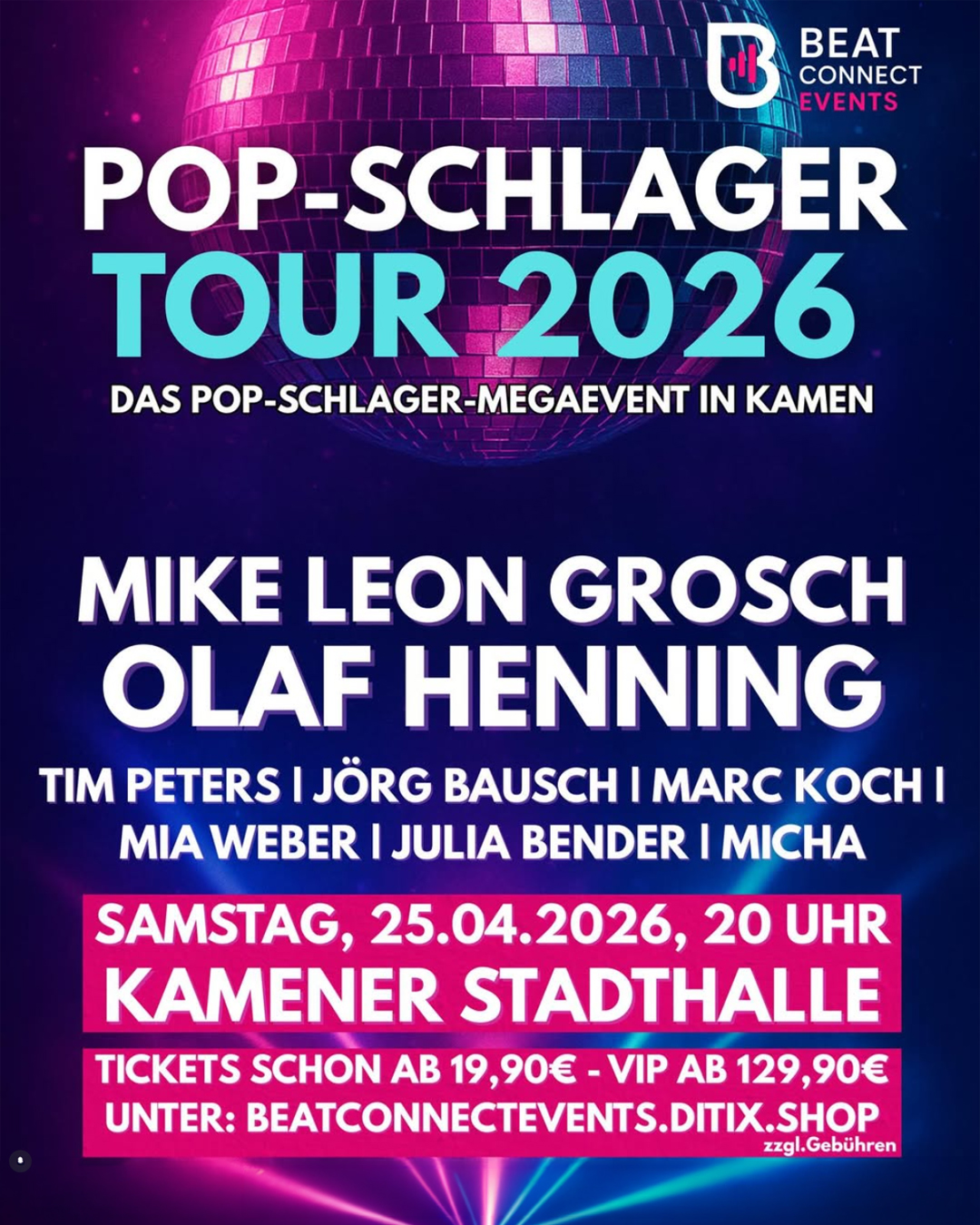 Am 25.04.2026 verwandelt sich die Kamener Stadthalle in eine riesige Partyzone! Freut euch auf ein mega Line-up mit Mike Leon Grosch, Olaf Henning, Tim Peters, Jörg Bausch, Marc Koch, Mia Weber, Julia Bender und Micha – beste Stimmung garantiert. Sichert euch jetzt eure Tickets ab 19,90 € (VIP ab 129,90 €) und erlebt einen Abend voller Hits, Emotionen und Partyfeeling!